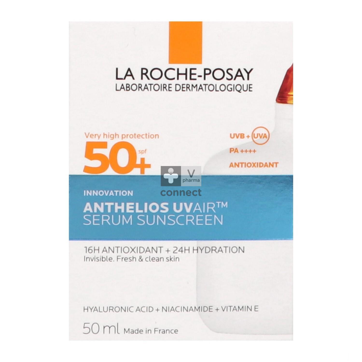 - La Roche-Posay Anthelios UVAir Serum Protection solaire SPF50+ est une protection solaire innovante qui perfectionne la peau avec un fini naturel et léger comme une plume. Ce sérum puissant est enrichi en ingrédients actifs, notamment en acide hyaluronique, en niacinamide et en vitamine E.