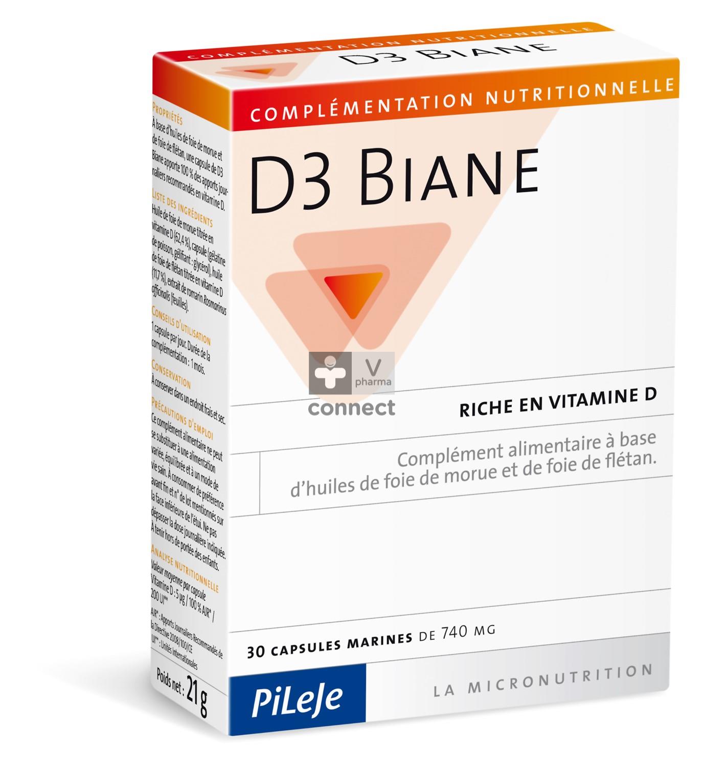 D3 Biane permet de compléter les apports alimentaires en vitamine D : une capsule contient 100 % des apports journaliers recommandés en vitamine D qui contribue au maintien d'une ossature normale et au fonctionnement normal du système immunitaire.