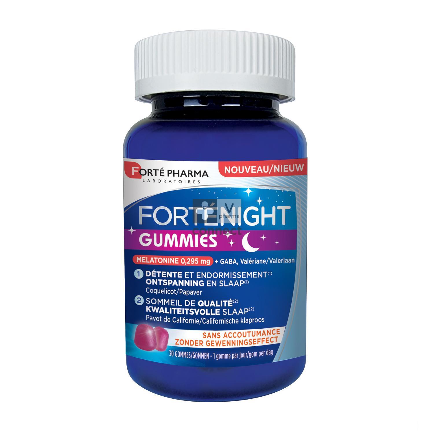 FortéNight Gummies is een voedingssupplement met melatonine dat de slaap bevordert. De formule met dubbele werking helpt de slaap te vergemakkelijken en de slaapkwaliteit te verbeteren dankzij Californische papaver. Het wordt vervolledigd door valeriaan en de neuromediator GABA (?-aminoboterzuur), dat van nature in het lichaam aanwezig is.