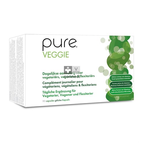 Pure Veggie bevat de belangrijkste vitamines en mineralen die men in dierlijke producten aantreft in de juiste dosering en de ideale chemische vormen. Men maakt uiteraard gebruik van een vegetarische capsule met enkel biologische rijstebloem en plantaardig magnesiumstearaat (= magnesiumzouten van vetzuren) als hulpstoffen.